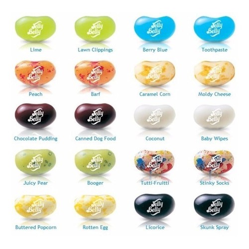 BeanBoozled Throwback Edition flavor menu. BeanBoozled jelly beans are lookalike flavors of some of Jelly Bellys most popular flavors Lime Buttered Popcorn Peach paired with some of the worst flavors imaginable Lawn Clippings Rotten Egg Barf. You could get one of our most popular flavors or one of our wildest.
